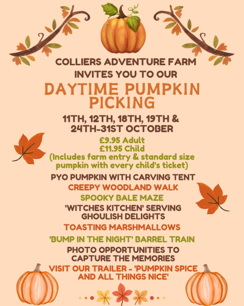 See other itemsColliers Adventure Farm invites you to our Daytime Pumpkin Picking from 11th, 12th, 18th,19th, 24-31st October